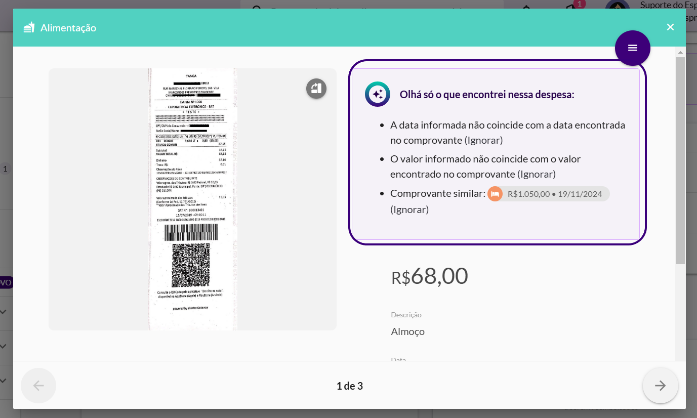 - Alerta de data não compatível: este caso acontecerá quando a data do comprovante não for a mesma data preenchida pelo colaborador na despesas.