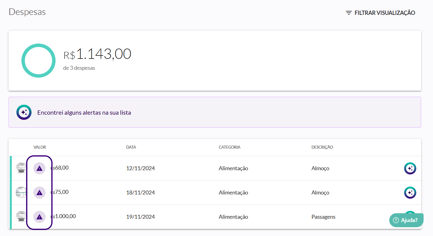O Antifraude conta com uma tecnologia que compara o texto do comprovante com os dados preenchidos pelo colaborador no momento de registrar suas despesas, gerando alertas quando identifica informações inconsistentes ou violação de políticas da empresa. Vale ressaltar que, os alertas do Antifraude são mostrados tanto na web quanto no aplicativo e aparecem dentro das despesas dos relatórios submetidos dessa maneira: