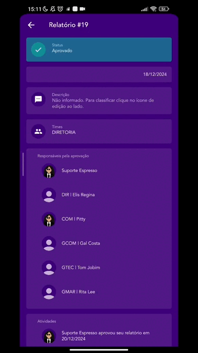Na página de relatório, as despesas reprovadas estarão destacadas com fundo de cor diferente. Já no aplicativo, esta despesa será sinalizada na lista com um ícone vermelho de reprovação.