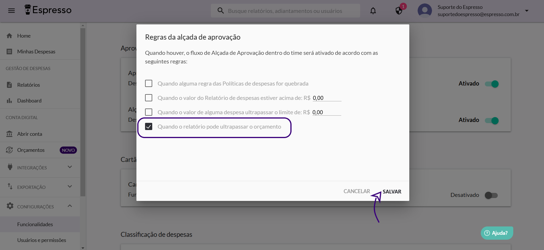 - Ao clicar na opção de ativar a Alçada de aprovação, será aberta uma tela onde você poderá configurar em quais cenários deseja que o relatório passe por uma alçada. Neste cenário, vamos escolher a opção "Quando o relatório pode ultrapassar o orçamento" e salvar.