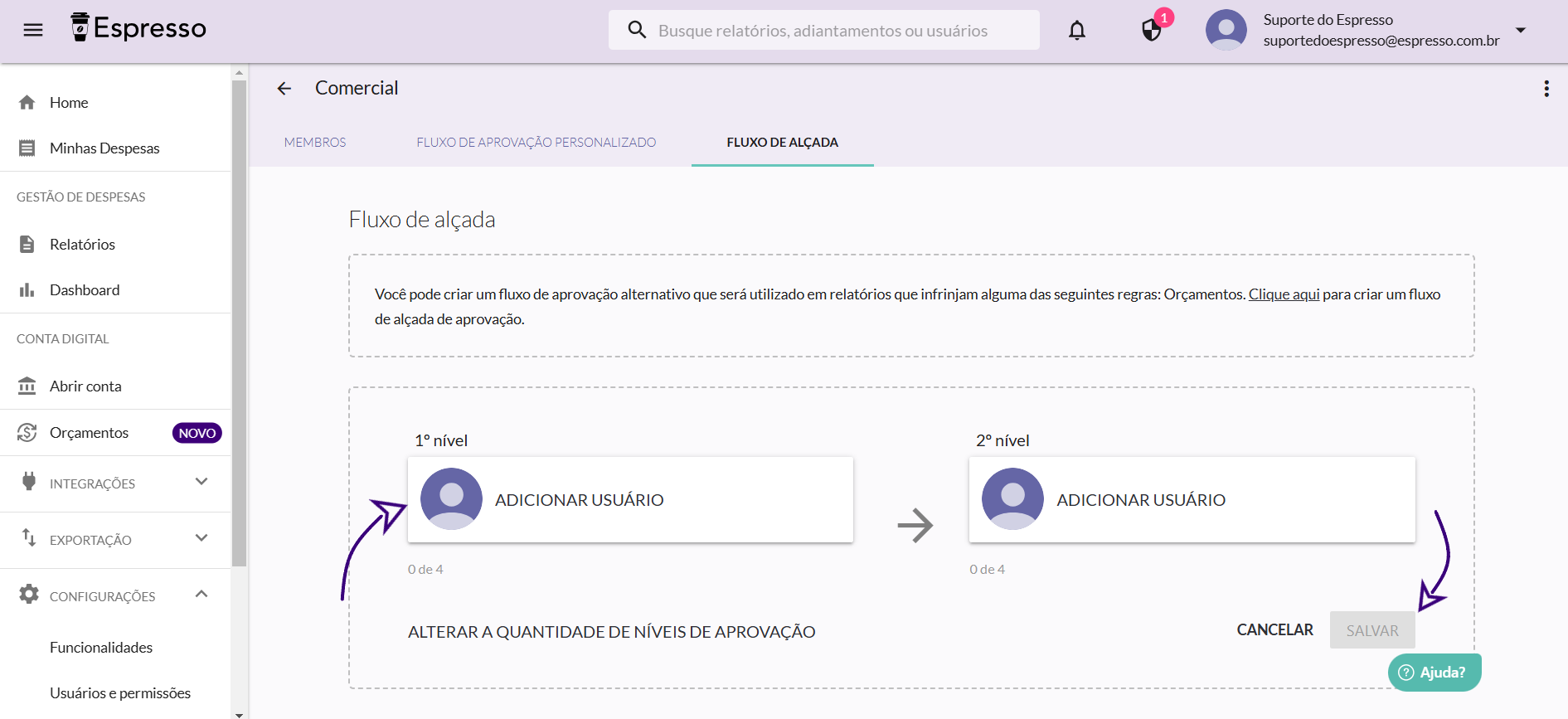 Para criar o fluxo de alçada, você poderá escolher até quatro níveis de aprovação, isso pode ser configurado de acordo com a necessidade da sua empresa. Após escolher a quantidade de níveis necessários, salve.