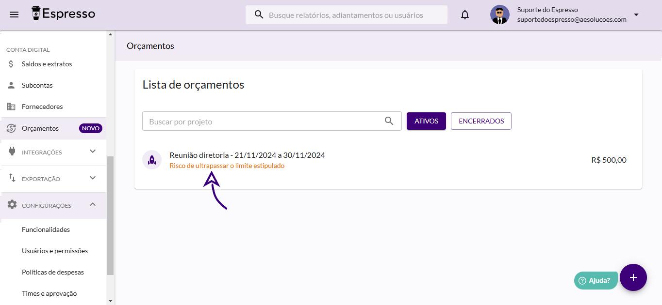 Ao acessar o orçamento será possível verificar o alerta sobre o limite excedido e tambem qual foi o valor que excedeu.