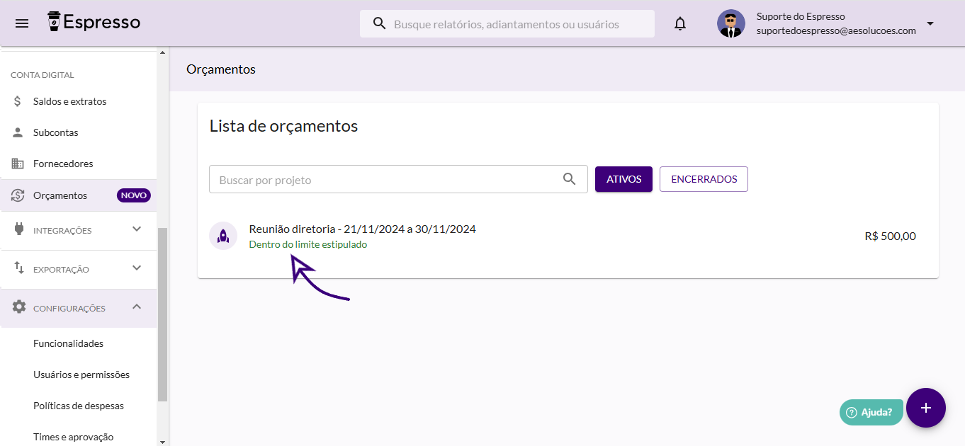 Esses status são atualizados automaticamente conforme as despesas do projeto são enviadas para aprovação ou aprovadas. Assim, você pode monitorar de maneira prática como o saldo disponível está evoluindo.