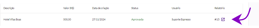 - Status - indica o status da despesa naquele momento, sendo "Aprovado" para despesas submetidas e aprovadas em relatório. "Reprovado" despesas submetidas e reprovadas em relatório. E "Em aprovação" despesas que foram submetidas, mas o relatório ainda não foi aprovado.