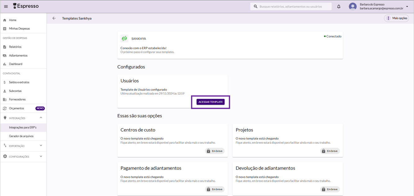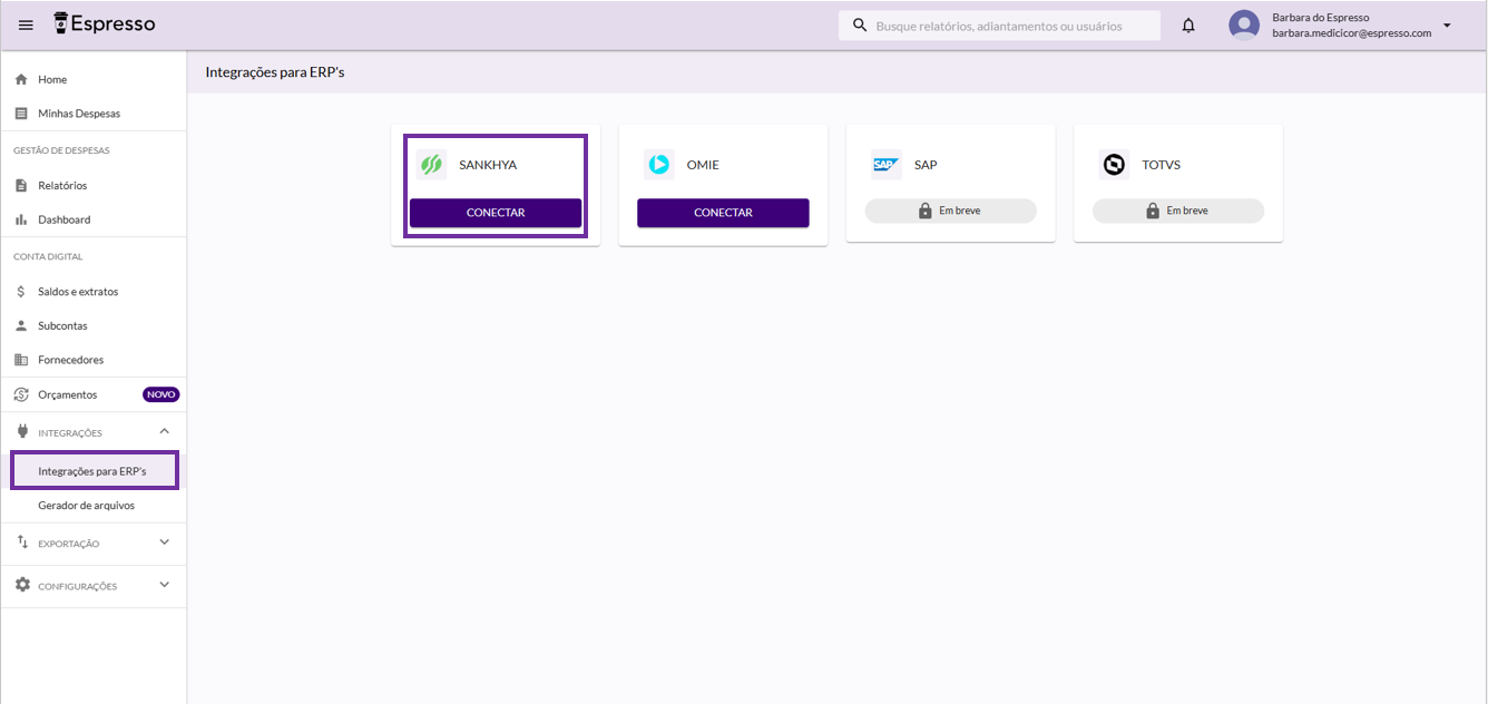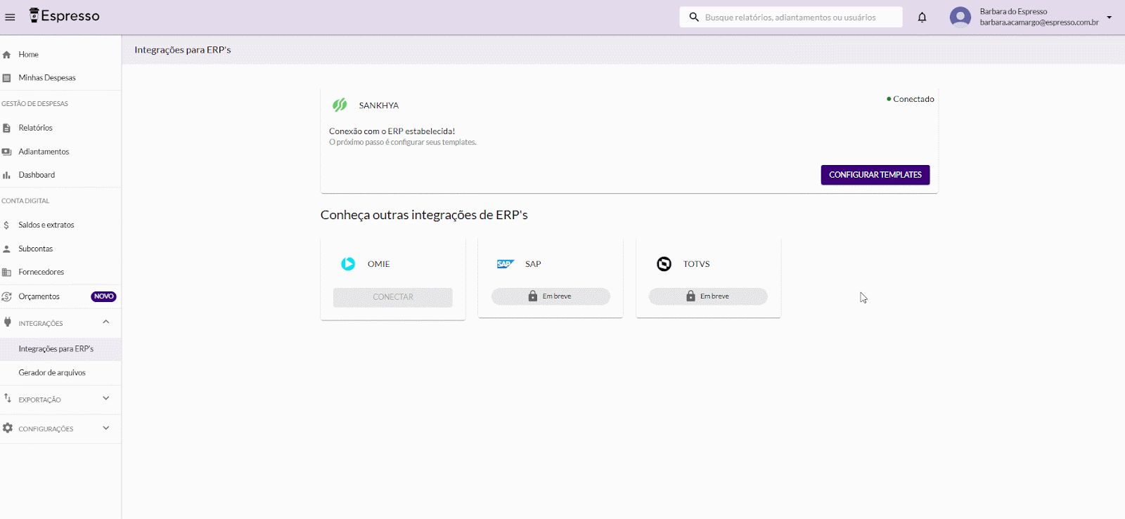 O Espresso oferece a Central de Integrações, onde administradores e usuários com perfil financeiro podem configurar a integração de usuários com o ERP Sankhya. Veja o guia completo para realizar essa integração: