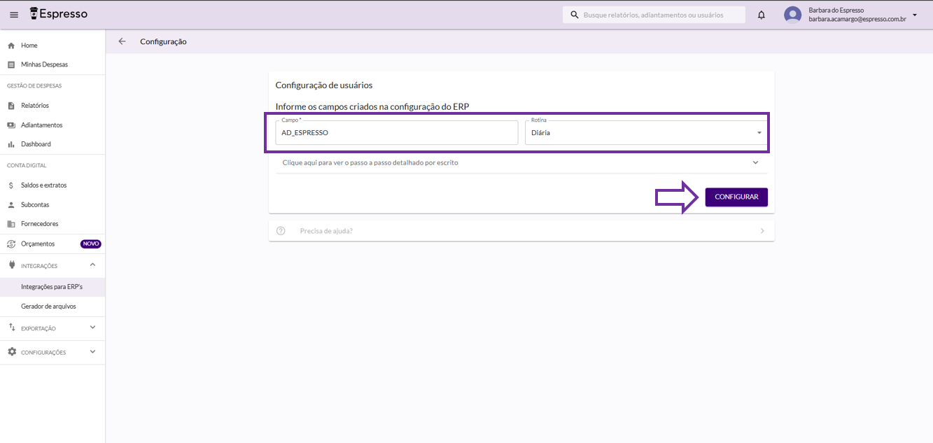 Volte ao Espresso, informe o nome do campo configurado e a rotina de atualização. Em seguida, clique em Configurar.