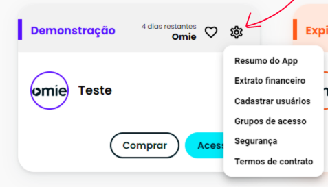 Para ter acesso a essas chaves, é só logar na sua conta no portal Omie, e na seção “Meus aplicativos”, clicar no ícone da engrenagem, e clicar em “Resumo do App”: