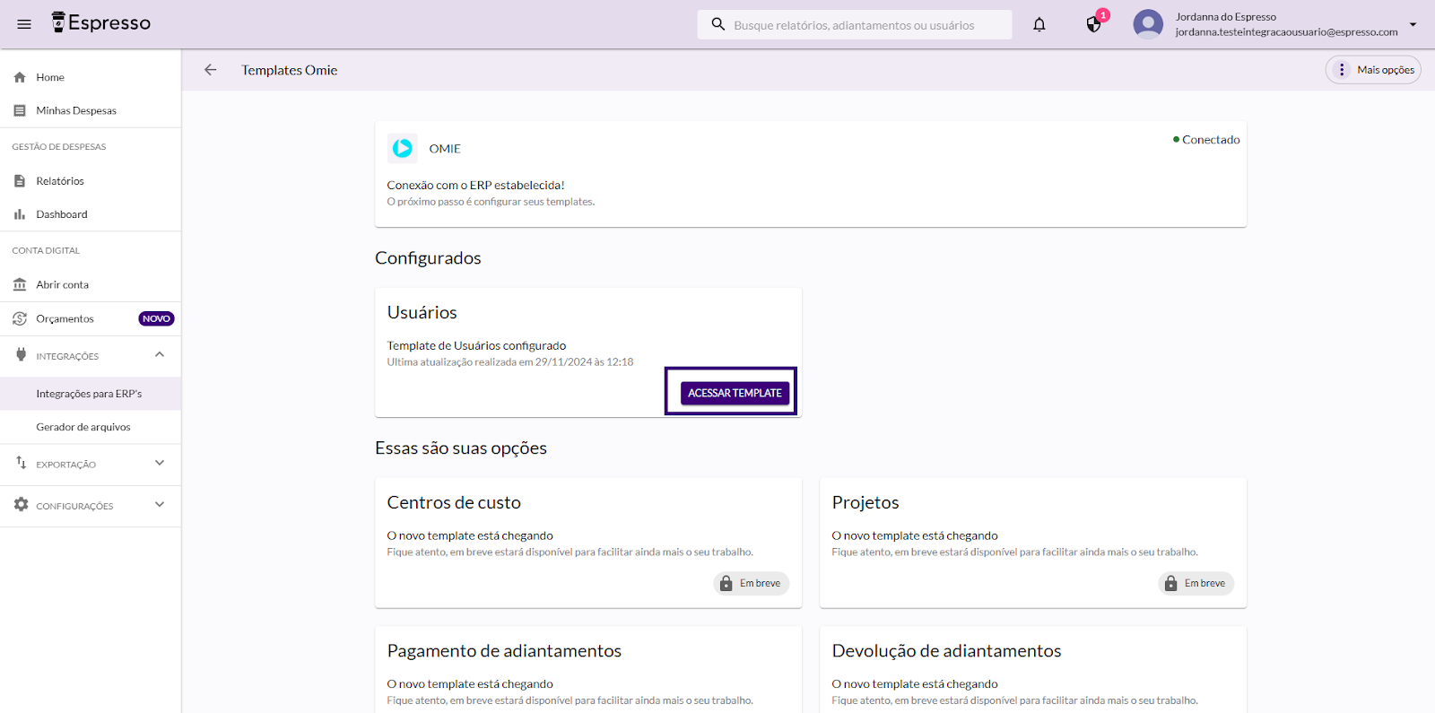 Com a conexão ativa, clique em Configurar Template. Escolha o tipo de integração, neste caso, Usuários, que permite criar e atualizar usuários no Espresso com base em Clientes e Fornecedores do Omie: