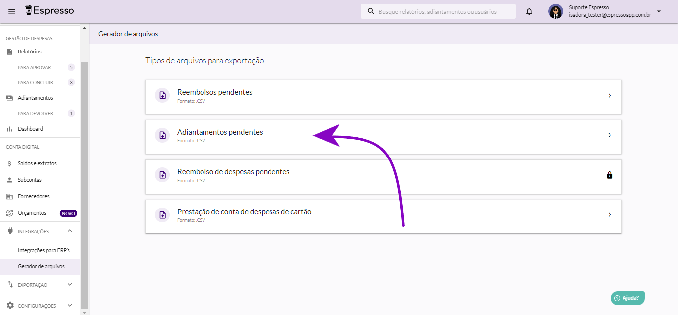Para acessar a funcionalidade, basta acessar o menu Integrações em Gerador de Arquivos, e selecionar a opção Adiantamentos Pendentes:
